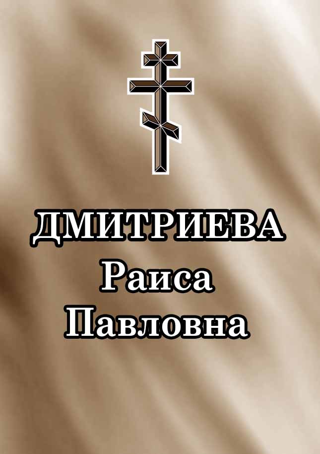 Упокой, Господи, душу рабы Твоей новопреставленной Раисы, и прости ей вся согрешения её вольная и невольная, и даруй ей Царствие Небесное. Во имя Отца и Сына и Святого Духа.